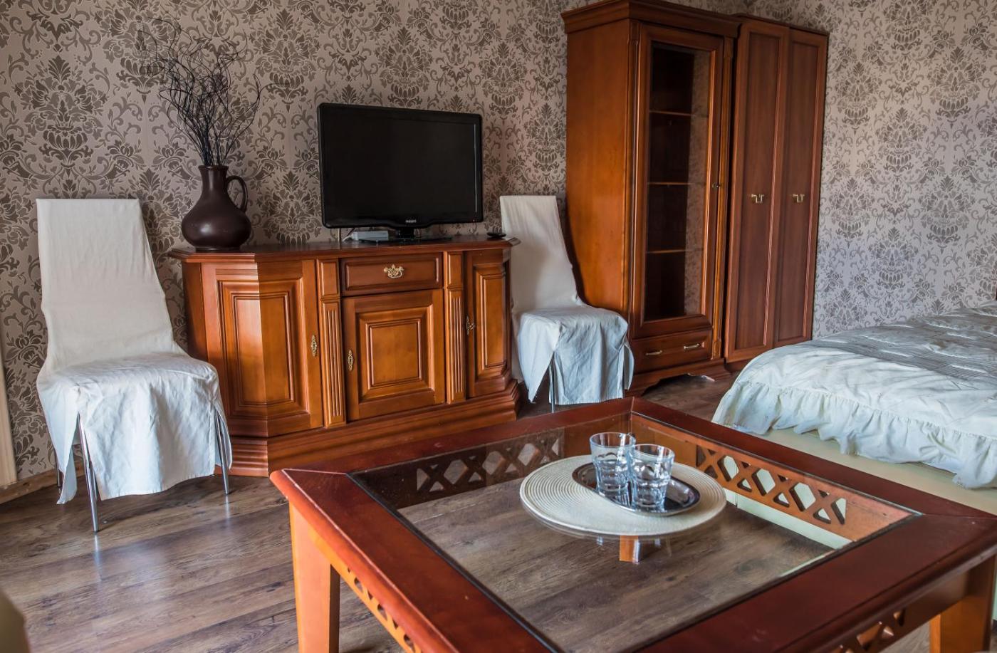 Pokój trzyosobowy. The triple room features a wardrobe and heating, as well as a private bathroom boasting a shower. This triple room provides a TV. The unit has 3 beds. Pokój Trzyosobowy - 3 osobowy.